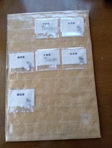 今回ご紹介する利用者さんは、市販のお薬カレンダーは使いにくいとのことで、段ボールに養生テープを巻いて薬包をセロハンテープで何度も貼り付けができるようにしたものを作成しました。布団の横に置きいつでもすぐに飲めるようにしたことで、「わかりやすいね。」と言っていただきその後は内服も飲み忘れなく行えておりました。